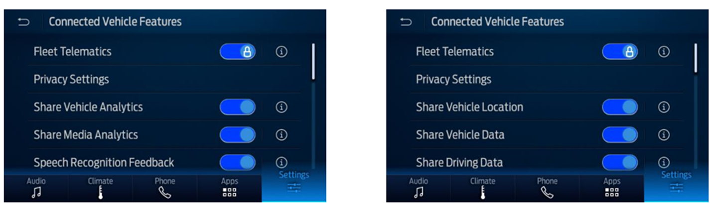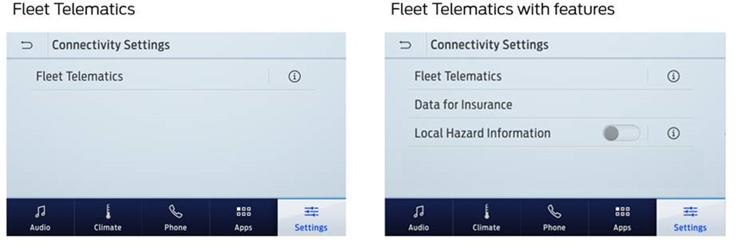 After successful enrollment with Data Services, below are some examples of how the screen will display, showing “Fleet Telematics”. This setting is no longer available to disable until unenrolled from Data Services.