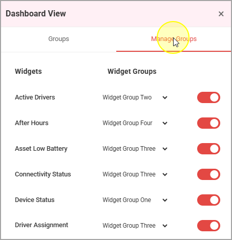 - To manage which Widgets are active and what Widget Group they are a part of, click on Manage Groups. Here you can turn on and off widgets, or move them to a different Widget Group if you'd like.