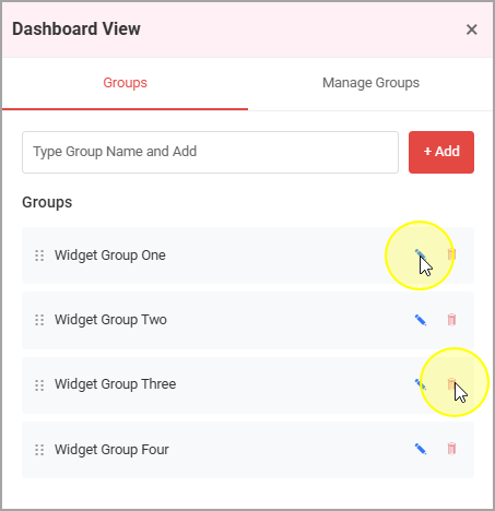 - To edit the names of your widget groups, or delete groups, you do so under the Groups area. Click the pencil icon to edit the name (and the green checkmark to save it), or the trashcan icon to delete the Widget Group entirely.