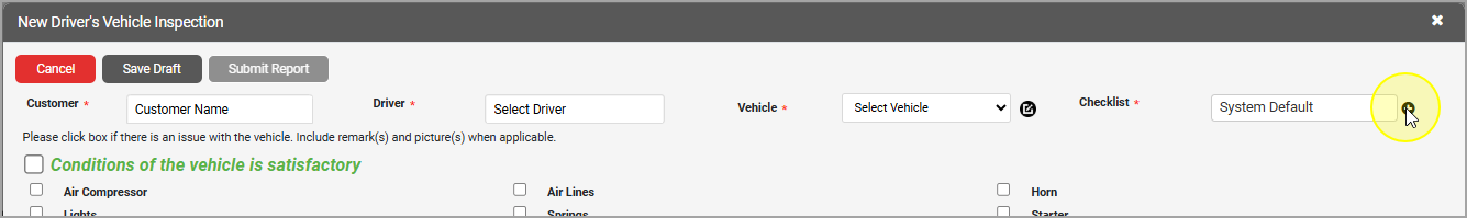 - Click on New Driver's Vehicle Inspection and the Default Checklist should pop up.