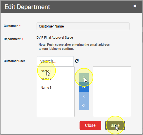 You can add different emails to each stage, just in case you have different people handling the Initial Report, Repairs, and Final Approval by clicking the edit icon next to the stage you'd like to edit and moving the names from the left to the right (or vice versa) side using the arrow buttons then clicking Save.