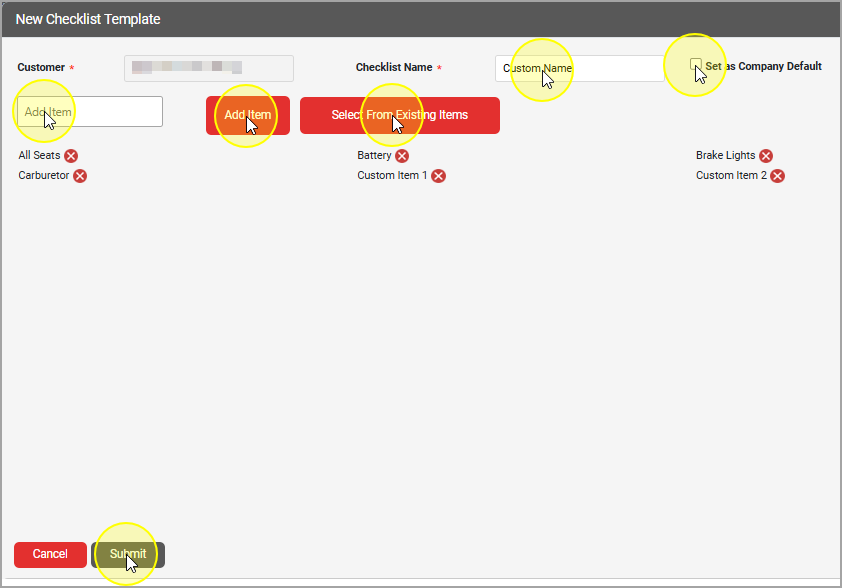 - Here, you can choose a Custom Name, Set as Company Default, and add whichever items you need on your checklist. To add a custom item, select the Add Item field and type in what you'd like to add, then click the Add Item button. To add from a list, click the Select From Existing Items button and check any items you'd like to add. Once complete, click the Submit button at the bottom.