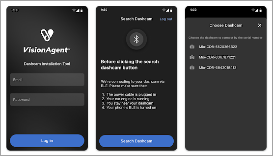 from your mobile device, log in, tap Search Dashcam, choose the camera, click Connect, and then Join. Adjust the lens position.