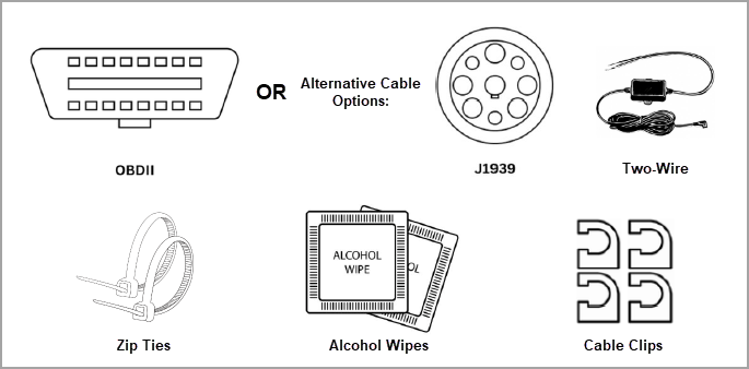 - There are optional cables for connection such as J-1939 or Hardwire