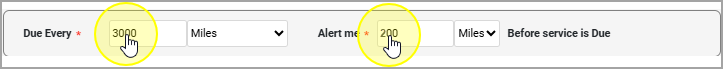 Ex: If you'd like to do an oil change every 3000 miles, and want the alert when they hit 2800 miles (200 miles prior to the maintenance), you would enter 3000 in the Due Every field, and 200 in the Alert me field.